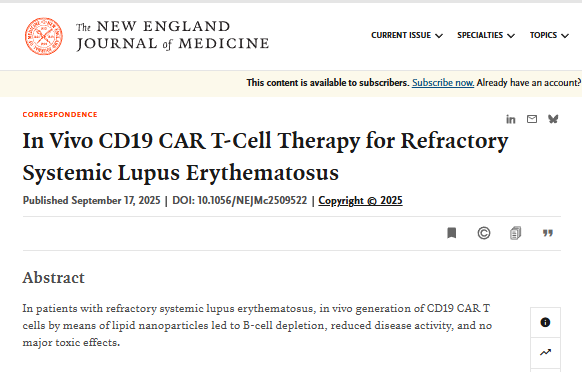 9月18日,国际权威医学期刊《新英格兰医学杂志》(The New England Journal of Medicine)在线发表一项重要医学突破——中国科学技术大学附属第一医院(安徽省立医院)风湿免疫科主任陈竹教授团队成功开展全球首次基于脂质纳米颗粒(LNP)体内嵌合抗原受体T细胞疗法(CAR-T)治疗系统性红斑狼疮(SLE)临床研究,并取得阶段性关键进展。该研究成果以“In vivo CD19-CAR T-Cell Therapy for Refractory Systemic Lupus Erythematosus”为题刊发,在国际上首次明确了基于靶向LNP体内CAR-T治疗SLE的临床可行性,为全球复发难治性系统性红斑狼疮患者带来希望。
