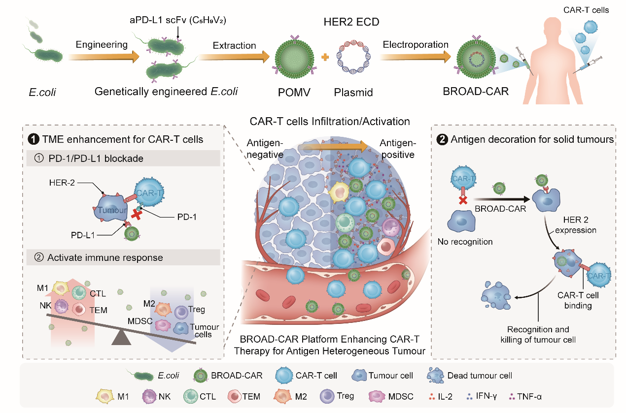 在国家自然科学基金联合基金、国家博士后创新人才计划、中国博士后科学基金等项目的资助下,郑桐森教授团队把目光投向了“细菌外膜囊泡”——这是细菌自然产生的微小囊泡,自带母体细菌的免疫激活特性。团队通过基因工程改造,给这些囊泡赋予了两大“超能力”,打造出了BROAD-CAR赋能平台。